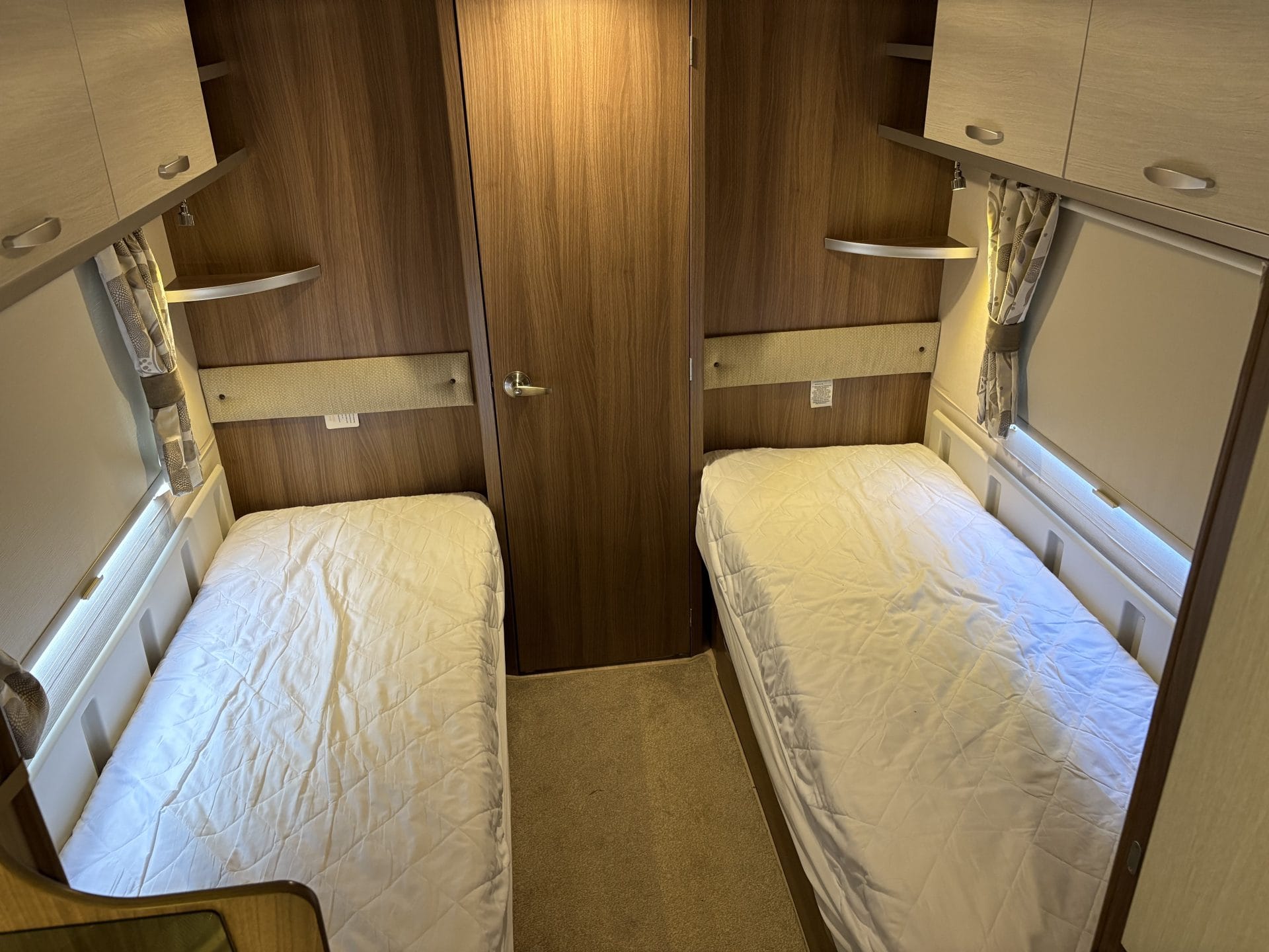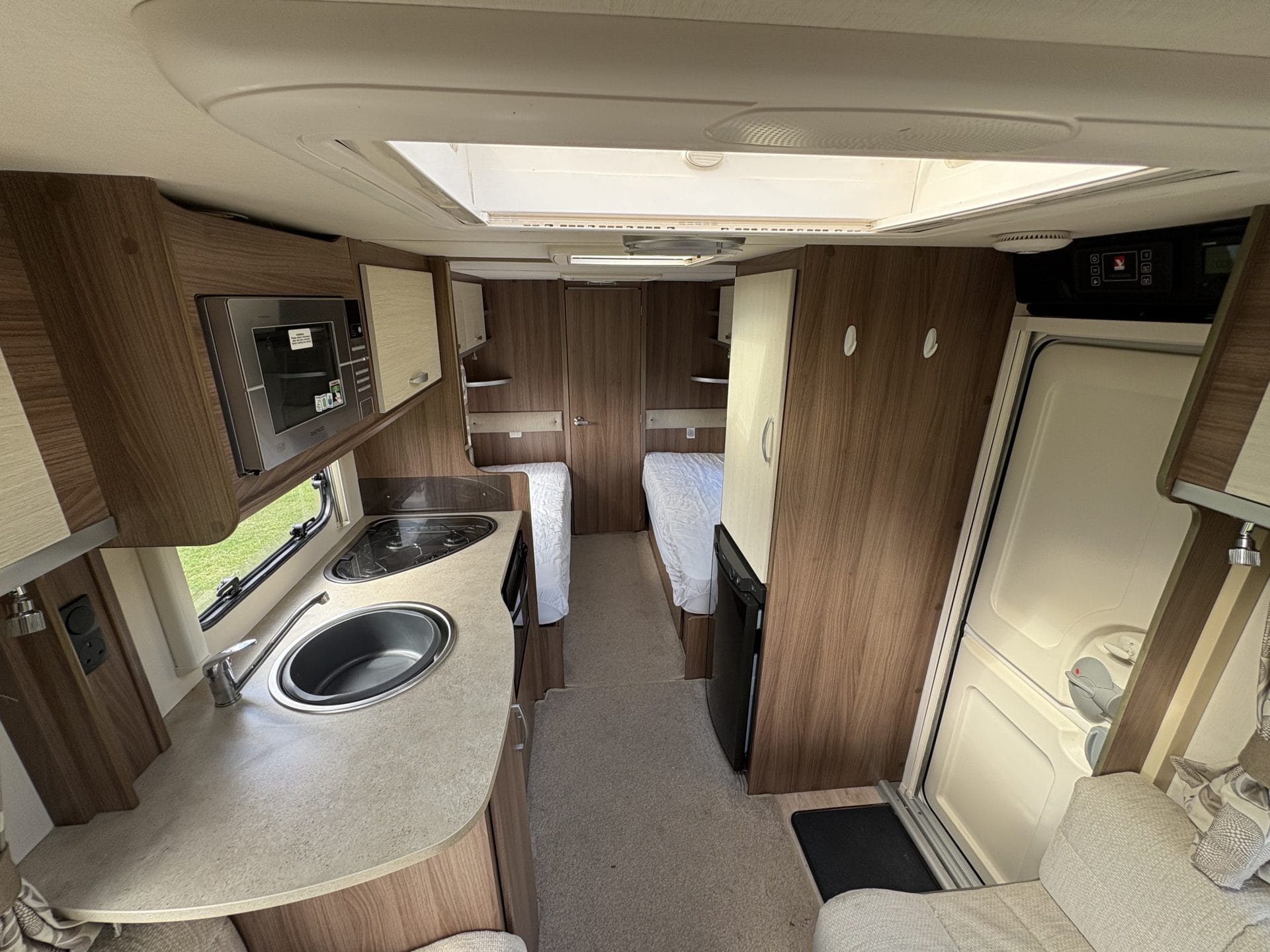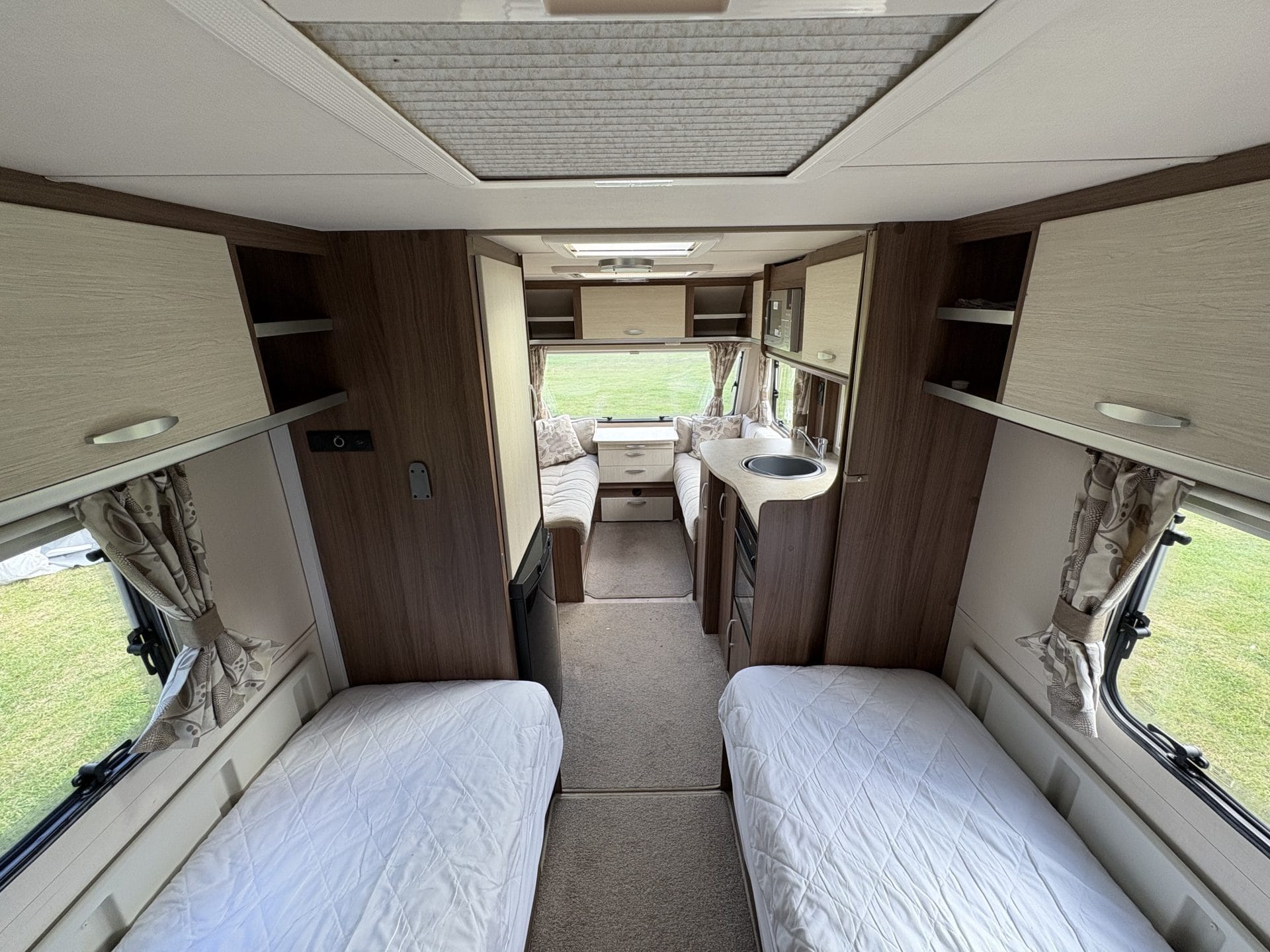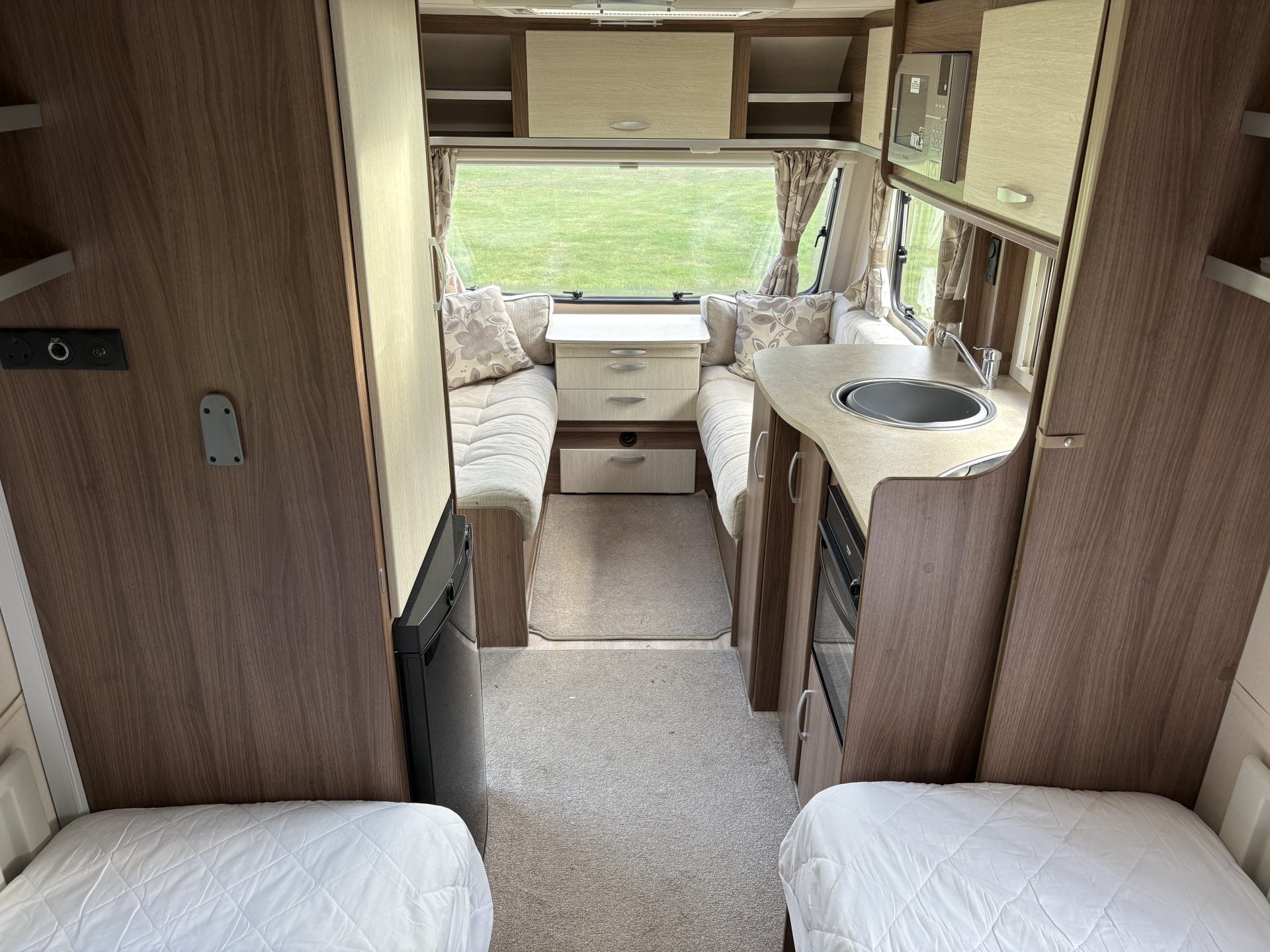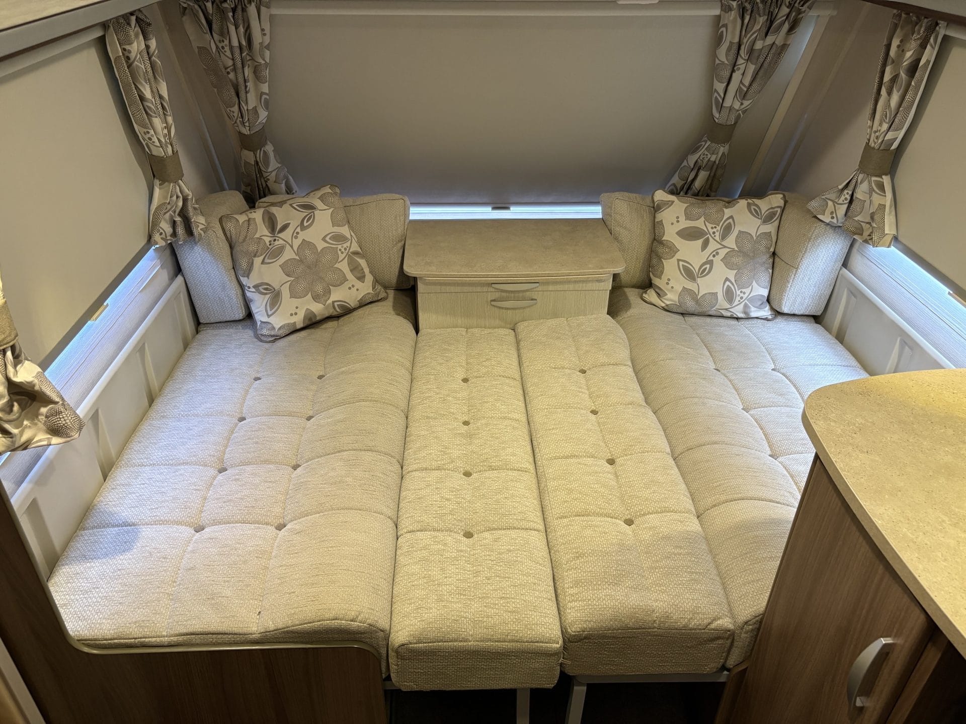 This 4-berth caravan features 2 single beds and a front lounge that converts easily into a king-size bed, making it ideal for couples and families alike.